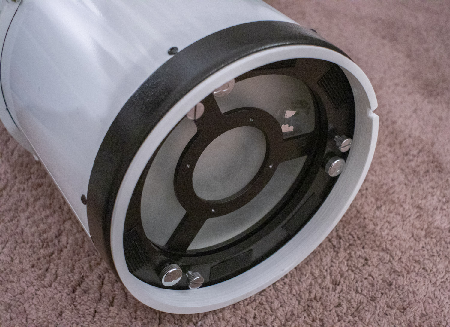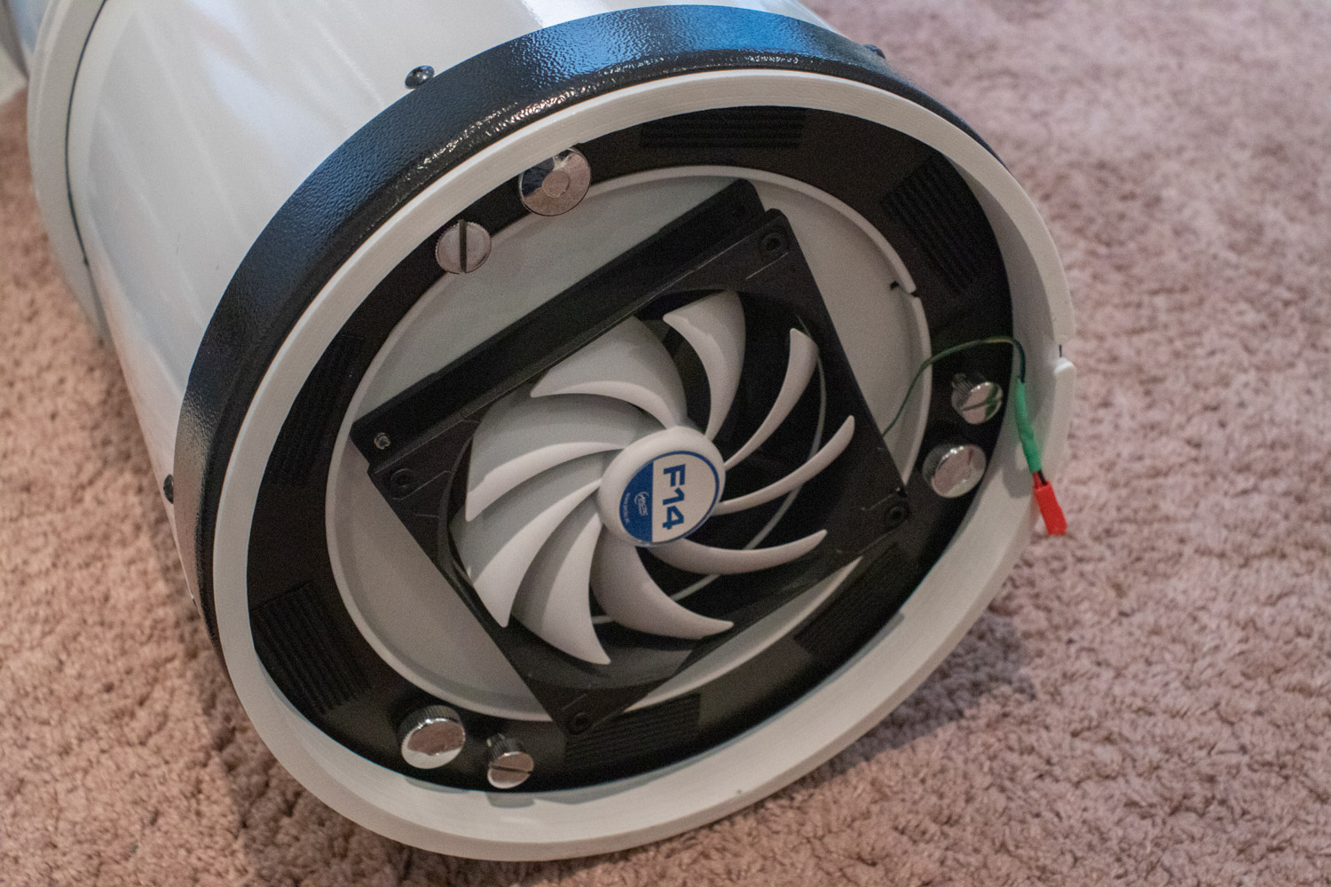 I have also printed an outer ring that acts as a stand off with a 5mm slot for the fan and temperature sensor cable to pass. This protects it from being crushed when the telescope is stood upright on the floor.