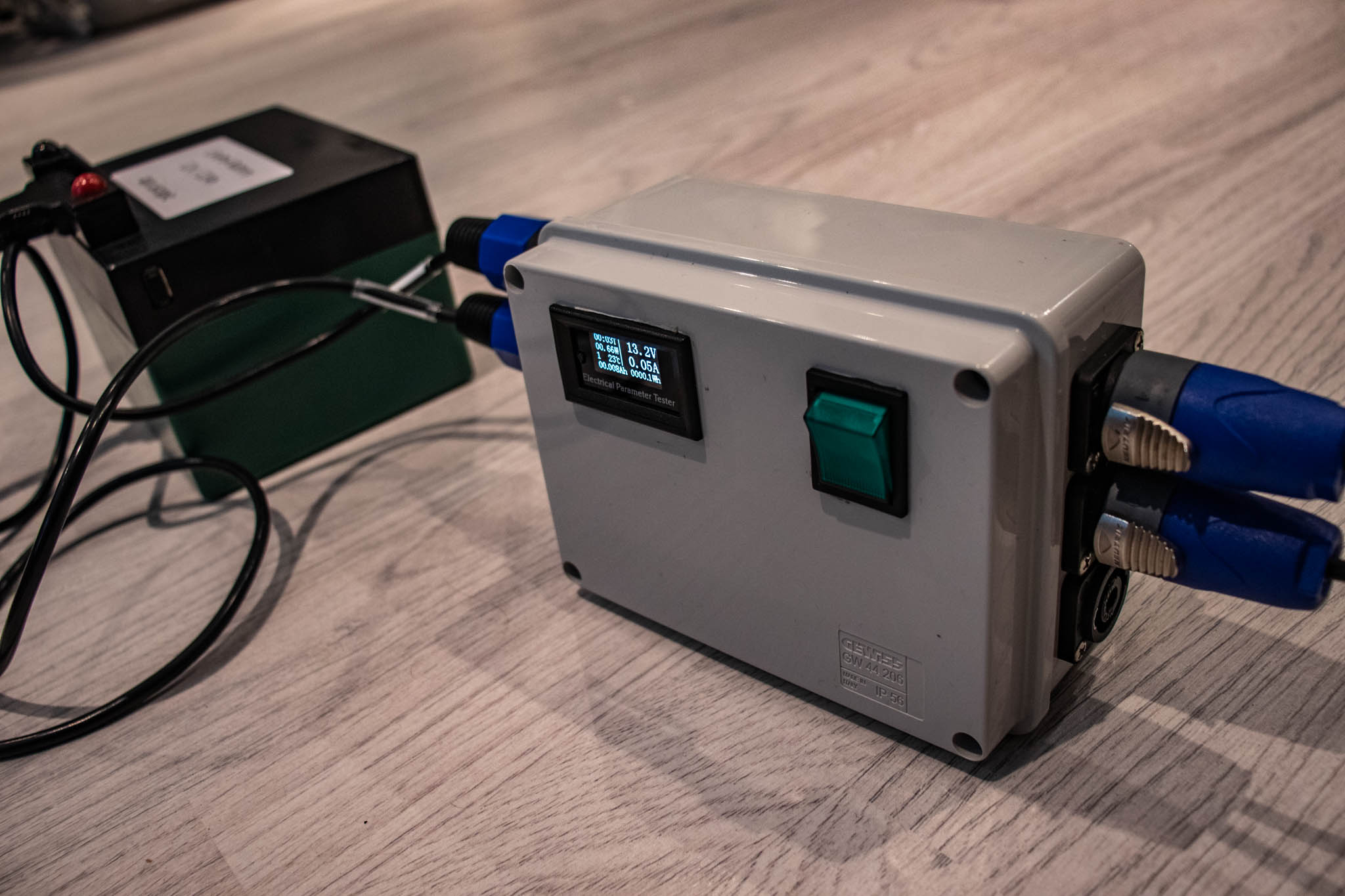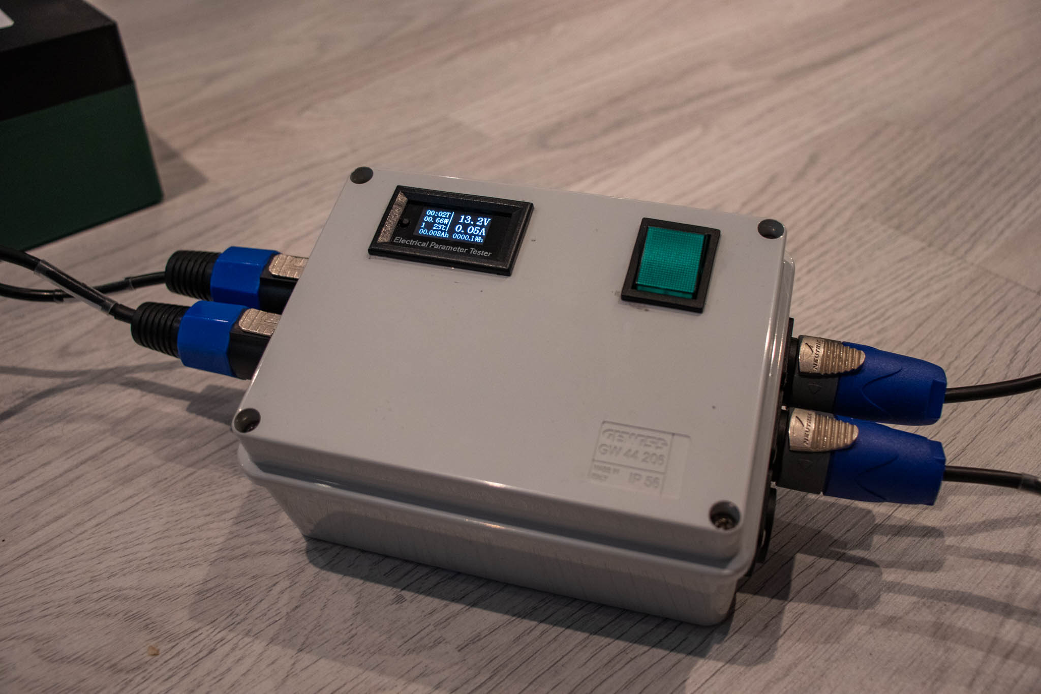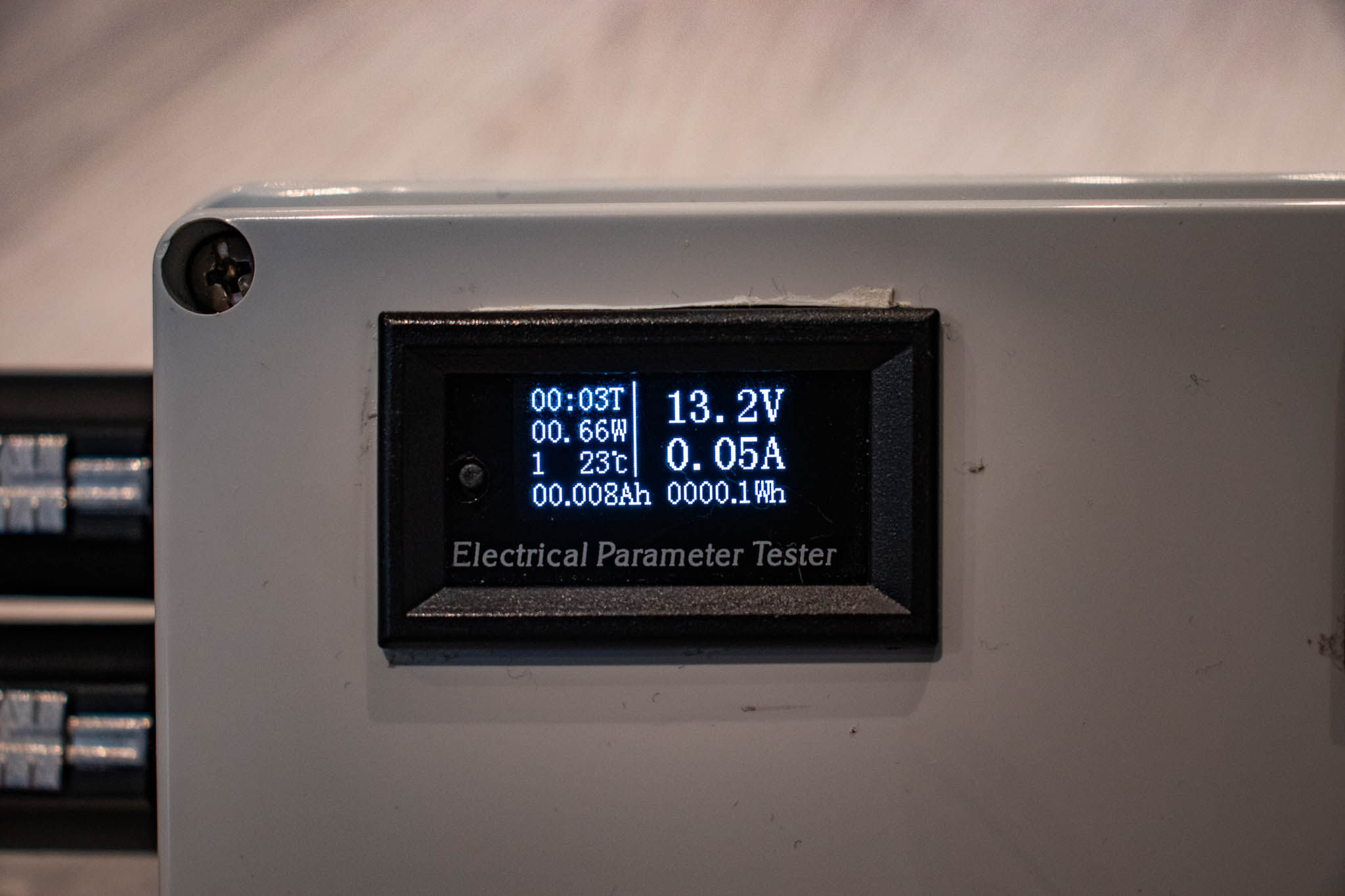 I used a simple power monitor that can display votlage and current along with the total energy used in the session. This allows me to see at a glance, the voltage remaining in the batteries as well as how much energy an imaging session has used.
