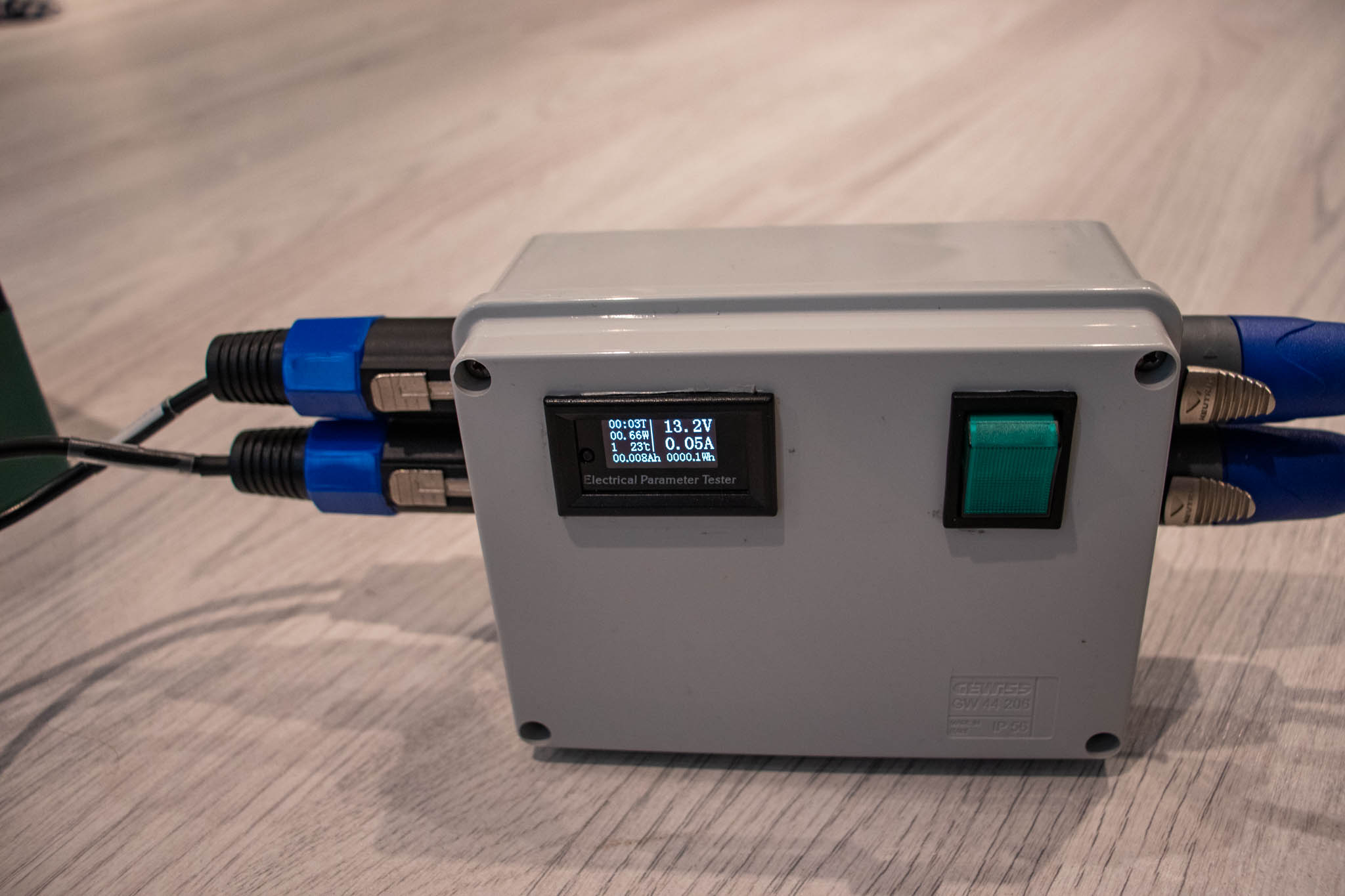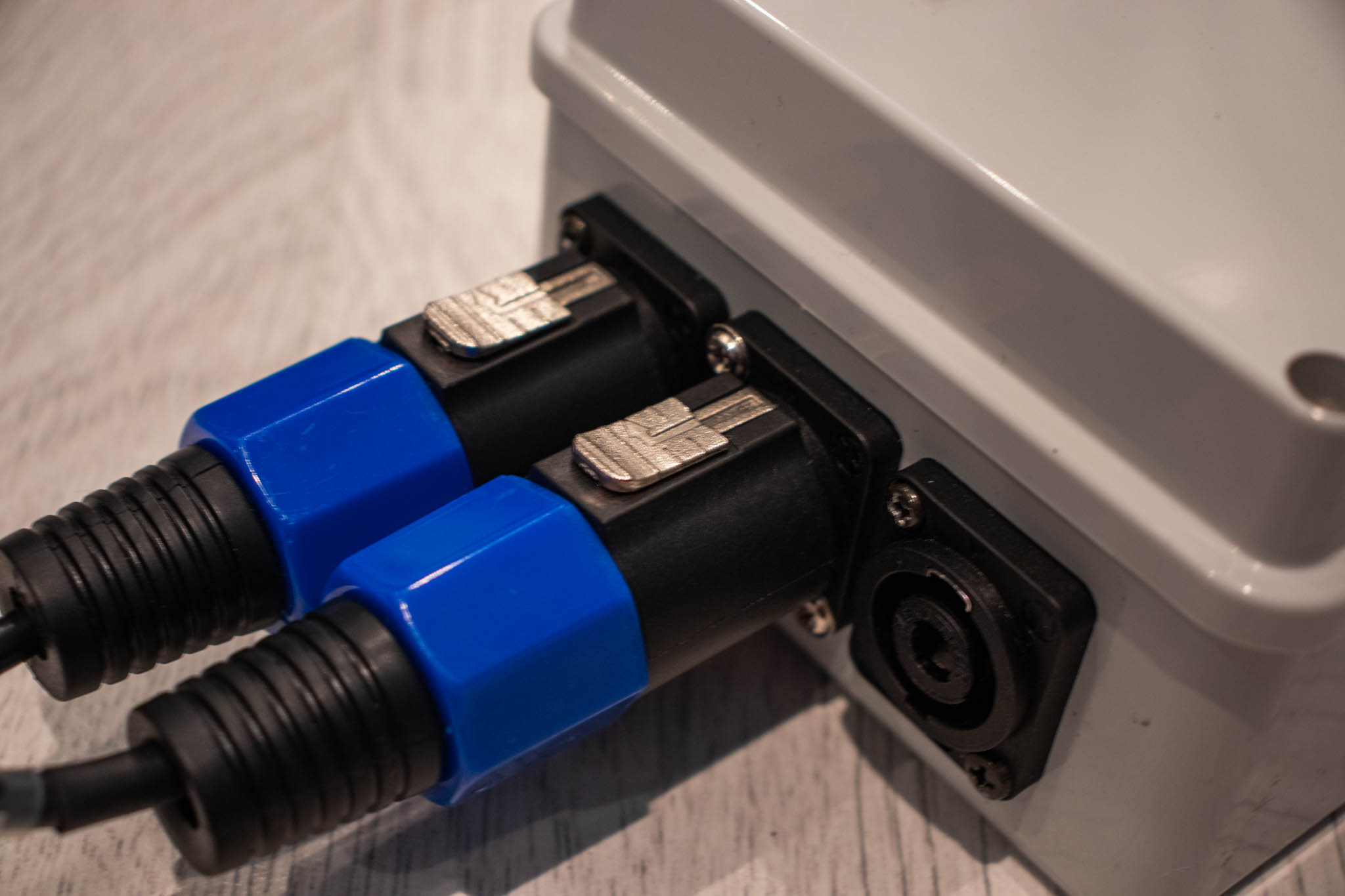 I used 4-pin speakon connectors for all of the 6x connectors. Each connector is wired such that inputs are on pins "2+ /2-" and outputs are on pins "1+/1-". This allows any connector to be used as both an input or an output, perfect when fumbling around in the dark!